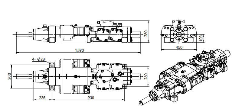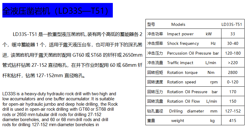 LD33S-T51 液壓鑿巖機是一款重型液壓鑿巖機,裝有兩個高低的蓄能器各 2個,緩沖蓄能器1個,適用于露天液壓臺車,也可用于井下的深孔鑿進,該鑿巖機用于露天鑿巖時配用 GT60或ST68 的桿或2650mm管式鉆桿鉆鑿 27-152 直徑炮孔,在并下作業(yè)時配用 60 或68mm桿和鉆桿,鉆鑿127-152mm 直徑炮孔。