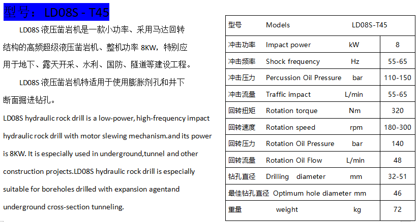 LD08S 液壓鑿巖機是一款小功率、采用馬達回轉(zhuǎn)結(jié)構(gòu)的高頻超級液壓鑿巖機、整機功率 8KW,特別應(yīng)用于地下、露天開采、水利、國防、隧道等建設(shè)工程