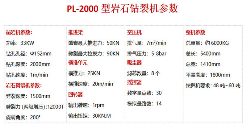 劈裂機(jī)參數(shù): 劈裂深度: 1500 mm 劈裂力(兩級(jí)增壓):30000 T 旋轉(zhuǎn)角度: 120°